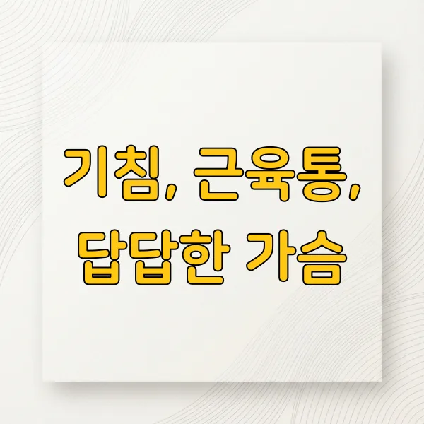 Q1. 기침, 근육통, 가슴 답답함이 같이 나타나는 건 흔한 일인가요? A1. 네, 흔하게 나타날 수 있어요. 감기, 기관지염, 폐렴 등 호흡기 질환이나 심장 질환, 근골격계 문제, 심리적인 요인 등 다양한 원인으로 복합적으로 나타날 수 있거든요.